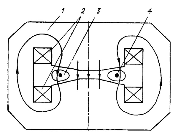 На рисунке 3 показана конструкция цикличного индукционного ускорителя (бетатрона) в разрезе. Здесь