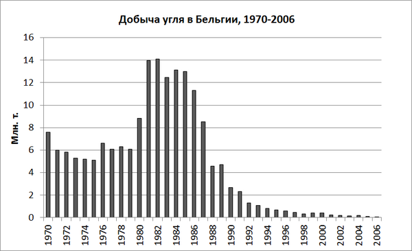 К настоящему времени добыча угля в Бельгии свёрнута: в 1980 г. были закрыты последние шахты подо Льежем, в 1984 — в Южной Валлонии, а в 1992 — в бассейне Де-Кемпен (шахта Зольдер). Согласно данным US EIA (англ.), производство угля в Бельгии завершилось в 2006 году.