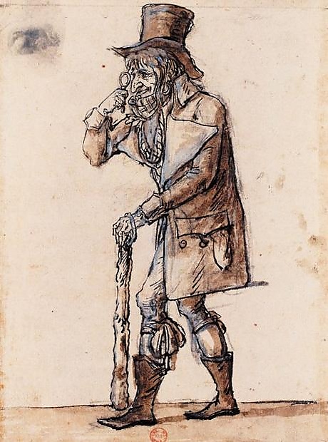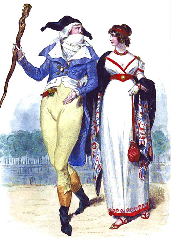 Стильными в это время стали очень короткие рединготы с большим воротником, с выпуклостью на спине как у горбатого, гигантский галстук, закрывавший подбородок и как будто скрывавший зоб или золотуху, обувь с острыми носами, как в средневековье. Обязательной была суковатая палка вместо трости.
