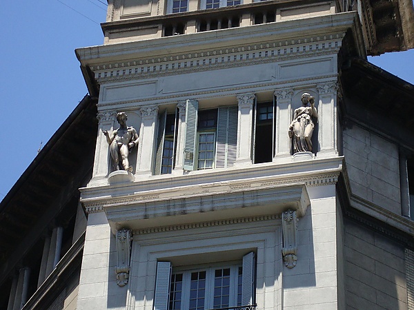 Здание занимает квартал по южной стороне проспекта Авенида де Майо по нумерации от 1400 до 1500, и боковые входы на улице Сан-Хосе 39 и на улице Луис Саенс Пена 60. Помимо коммерческих помещений, на верхних этажах здания расположены 51 жилых номеров.[4] Стиль здания характеризуется как Нео-Ренессанс, и его фасад имеет общую осевую симметрию, отмеченную двумя куполами на крыше. Они расположены по углам Авенида де Майо, покрытые железом и цинком, красноватого цвета.[1] Первоначально они были темно-серого цвета, но во время реставрации в 1968 году один из них потерял покрытие из шифера и стал кирпичного цвета. Таким образом, два купола были разных цветов, пока в ходе реконструкции в 1993 году, наконец, оба были окрашены в один цвет, как они видны сегодня. Пара статуй греческих богов Венеры и Аполлона украшают здание и его центральный вход, в то же время на проспекте Авенида де Майо расположены лоджии, галереи, колонны поддерживающие арку, типично итальянского стиля и украшены граффити, которые в настоящее время сильно повреждены.