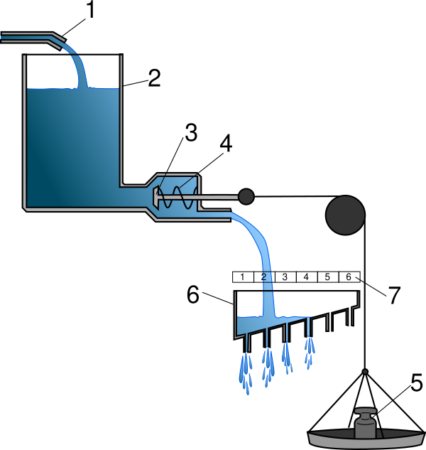 В гидравлической модели специфическая энергия действия представлена водой, непрерывно текущей в резервуар. Отток воды из резервуара преграждён клапаном, к которому крепится груз. Груз обозначает действие специфических раздражителей, его вес прямо пропорционален интенсивности раздражителя. Вода из резервуара может вытечь в двух случаях: если суммарное давление воды и груза откроют клапан, либо уровень воды превысит допустимый и клапан откроется под напором воды.[59]