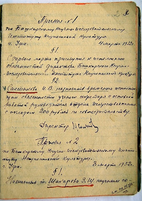 «С первого марта 1932 г. приступил к исполнению обязанностей директор Башкирского научно-исследовательского Института национальной культуры Михаил Арефьевич Солянов».
