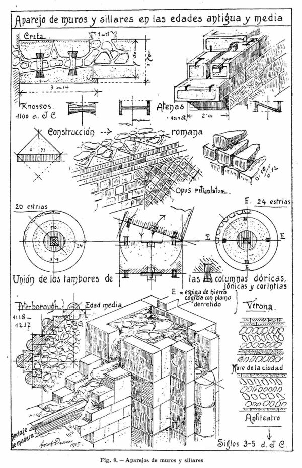 Основным материалом в конструкции стен был кирпич. Из сплошной кирпичной кладки выполнялись более нагруженные части стен — узкие простенки, столбы, разгрузочные арки в стенах и перемычки над проёмами и т. д. Менее нагруженные участки стен имели наружную и внутреннюю вёрсту (равно как и откосы проёмов) из кирпичной кладки, а внутренняя часть стены была заполнена забутовкой; если такие участки стен были большими, они разделялись своего рода скрытым каркасом — находящимися в массиве стены столбами и горизонтальными перемычками из кирпичной кладки. В тех случаях, когда бутовая засыпка плотно заливалась известковым раствором и трамбовалась, такая конструкция — opus caementicium (называемая в наше время римским бетоном[72]) приобретала несущую способность, не уступающую основной кладке. Введение в строительную практику этого своеобразного бетона[K 13] позволило удешевить дома, сооружаемые для растущего населения Рима. Хотя Витрувий сомневался в долговечности и прочности смеси, которая, по его мнению, лишь по истечении 80 лет становилась крепкой, он выражал своё восхищение новыми домами (около 25 года до н. э.) из бетона и обожжённого кирпича.