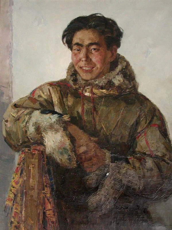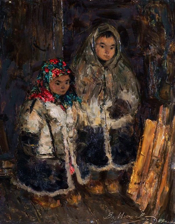 На картине изображены двое детей — мальчик и девочка, сидящие рядом и склонившиеся над раскрытой книгой. Девочка одета в светлую меховую одежду и жёлтый платок, мальчик — в меховую одежду с капюшоном, выполненную в охристо-серых тонах. Сцена отражает моменты повседневной жизни и характерна для бытового жанра, акцентируя внимание на совместном чтении и детском любопытстве.