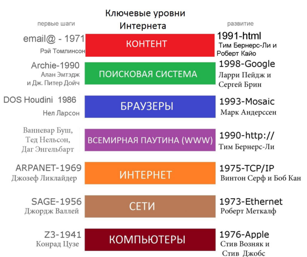 Принципы, по которым строится Интернет, впервые были применены в сети ARPANET, созданной в 1969 году по заказу американского военного агентства DARPA[12][13][14]. Используя наработки ARPANET, в 1984 году Национальный научный фонд США создал сеть NSFNET для связи между университетами и вычислительными центрами. В отличие от закрытой ARPANET, подключение к NSFNET было достаточно свободным. С передачей опорной сети NSFNET в коммерческое использование появился современный Интернет[15][16].