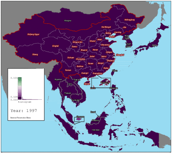 Согласно первому статистическому исследованию китайского сегмента Интернета, проведённому в 1997 году CNNIC, в Китае было 290 тысяч компьютеров, подключённых к Интернету, 620 тысяч пользователей, 4066 зарегистрированных доменных имён, 1500 веб-сайтов[4].