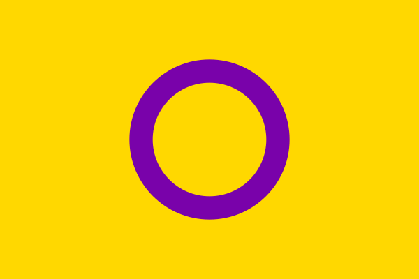 Интерсекс-флаг был создан организацией Intersex International Australia в июле 2013 года. Организация стремилась создать символ без использования гендерных розовых и синих цветов. Флаг содержит жёлтый и фиолетовый, как «гермафродитные» цвета. Круг символизирует «целостность, полноту и потенциал»[83].