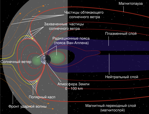 В исследованиях космического пространства, проводимых на первых автоматических межпланетных станциях и искусственных спутниках, удалявшихся на расстояние более 100 000 км от Земли, было обнаружено новое явление — бесстолкновительная ударная волна[1][2], отделяющая солнечный ветер от магнитосферы[3]. Гипотеза о существовании ударных волн такого типа впервые была выдвинута в 1959 году Р. З. Сагдеевым (впоследствии — академик и директор Института космических исследований)[4]. Возникающий на границе магнитосферы и ударной волны токовый слой, называемый магнитопаузой, разделяет магнитосферу, где действует магнитное поле Земли, и межпланетную среду. Положение ударной волны и магнитопаузы в пространстве, определяемые балансом динамического давления солнечного ветра и магнитного давления магнитосферы, непрерывно изменяются в зависимости от текущих параметров солнечного ветра[5].