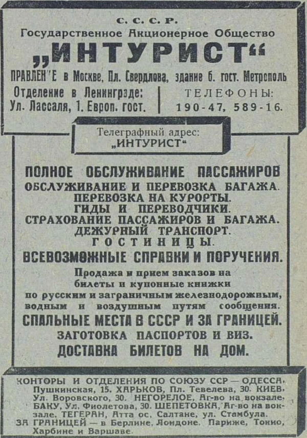 Для развития туризма в 1933 году государственное акционерное общество по иностранному туризму в СССР «Интурист» было объединено со Всесоюзным акционерным обществом «Отель» и получило в своё распоряжение сети гостиниц, ресторанов и автотранспорт[2]. Уставный капитал общества составлял в этот период 35 млн. руб[3].