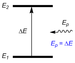 При поглощении фотона происходит возбуждение — увеличение энергии молекулы: она переходит из основного колебательного состояния E1 в некоторое возбуждённое колебательное состояние E2 так, что энергетическая разница между этими уровнями равна энергии фотона[7].