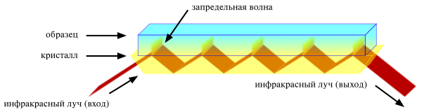 Метод основан на отражении пучка на границе раздела двух фаз: фазы кристалла НПВО с относительно высоким показателем преломления и фазы исследуемого образца с более низким показателем преломления. Если пучок излучения падает на плоскость образца под углом падения больше критического, то наблюдается практически полное отражение пучка от поверхности образца. На самом деле излучение на небольшую глубину проникает в фазу образца, где частично поглощается. При последующих попаданиях того же пучка света на образец это явление повторяется, и в результате получается некое подобие спектра поглощения. Наблюдаемые частоты поглощённого излучения будут совпадать с частотами, получаемыми в ИК-спектроскопии пропускания[31].