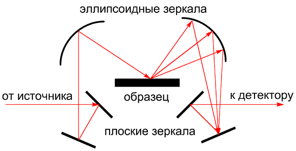 Диффузное отражение возникает на шероховатой поверхности и не сфокусировано в определённой точке, поэтому для работы с ним используются эллипсоидные зеркала, одно из которых фокусирует ИК-излучение на образце, а второе «собирает» отражённый свет и отправляет его на детектор. Спектроскопия диффузного отражения нашла применение в анализе порошков, а также волокнистых материалов (бумаги, ткани)[35].