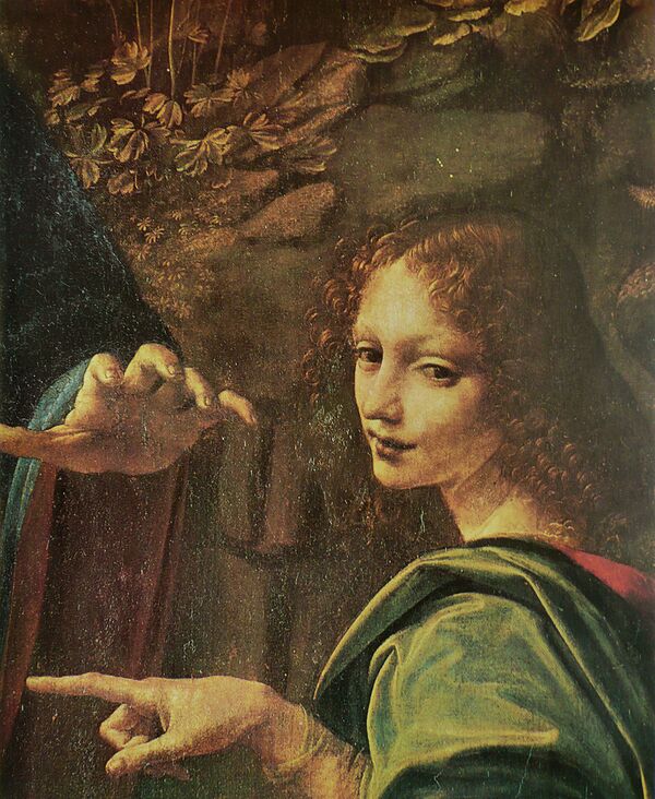 Традиционным для изображений Иоанна Крестителя считается и жест правой руки, направленный вверх. Впрочем, этот жест в определенном смысле является традиционным и для творчества Леонардо, его можно обнаружить в ряде законченных произведений («Тайная вечеря», «Мадонна в скалах», «Мадонна с Младенцем» (1510) и др.), а также набросков.