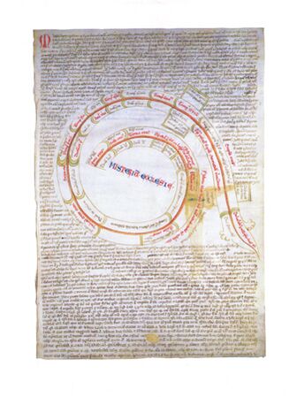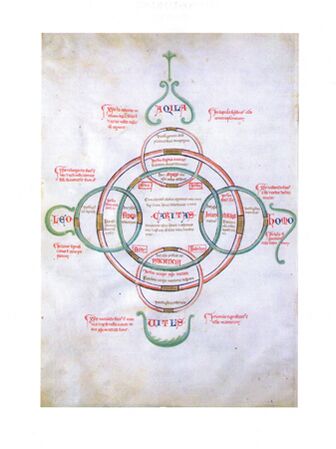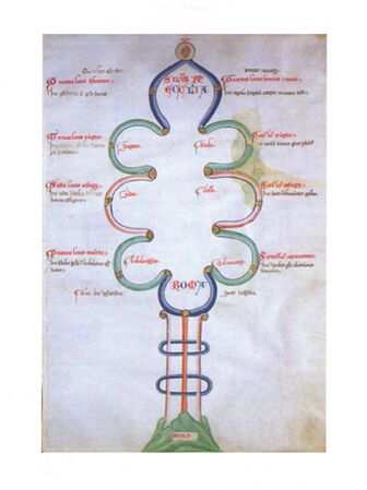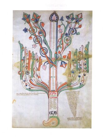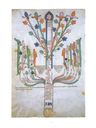 - 6—12) типический смысл (лат. typice) или поиск соответствий (сопоставляются различные исторические события по их соответствию друг другу), который Иоахим называл «согласованием» (лат. concordia). Подразделяется на семь видов. Этот смысл использован Иоахимом для разработки концепции мировой истории: он наложил друг на друга события Ветхого и Нового Заветов и стал предсказывать события будущего. Этот смысл объяснял Семь дней творения применительно к каждой из трёх эпох мировой истории и позволял толковать Откровение Иоанна Богослова (Апока́липсис).