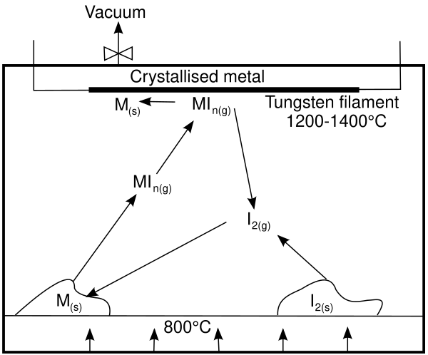 Черновой металл с добавкой некоторого количества иода помещают в герметичную камеру. Зону камеры, где находится эта смесь, разогревают до температуры 400 — 600 °C (в зависимости от очищаемого металла), при этой температуре образуется иодид металла, который при такой температуре находится в газообразном состоянии. Затем пары иодида металла попадают в зону камеры, нагретую до температуры разложения иодида (1300 — 1700 °C). В ней происходит разложение иодида с выделением чистого металла на стенках камеры. Оставшийся после разложения иод попадает обратно в зону низкой температуры, взаимодействует с новой порцией металла, и цикл повторяется, пока в зоне низкой температуры не остаются примеси, которые с иодом не взаимодействуют.