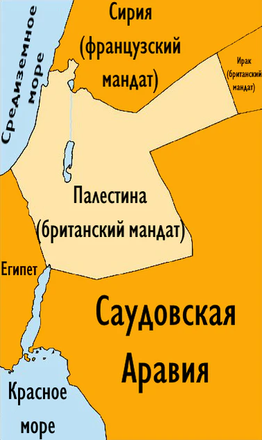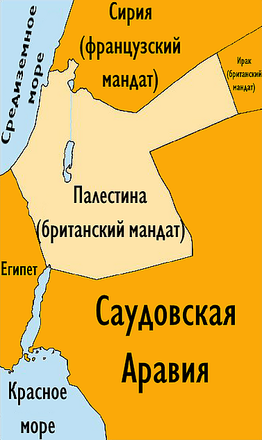 После I Мировой войны, на Мирной конференции в Париже в 1919, было принято решение, что Палестина перейдёт под управление Великобритании в качестве подмандатной территории Лиги Наций. «Палестина» была определена как область, включающая территории, на которых сегодня располагаются Израиль, Иордания и северо-западная часть Саудовской Аравии.