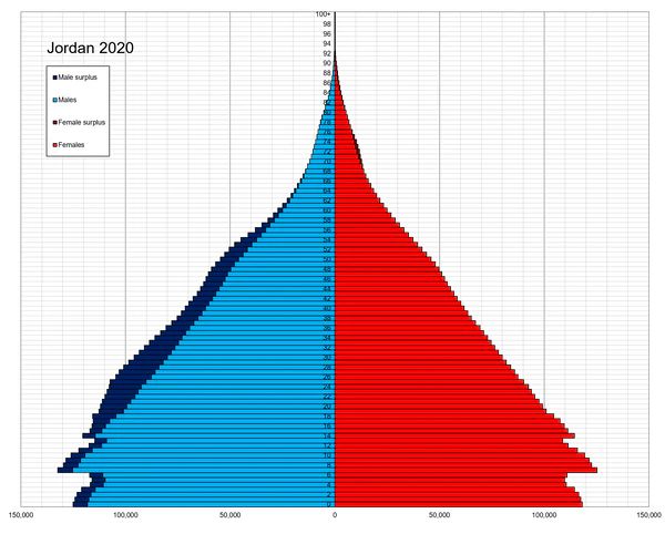 Население Иордании составляет 6,2 млн, 95 % населения — арабы. Иорданцы составляют 35 % населения, палестинцы — 55 %[17]. Другие национальности: адыги (черкесы), чеченцы, армяне, туркоманы, курды и другие. Проживает также много иорданцев европейского происхождения и арабов из Ирака и Сирии.