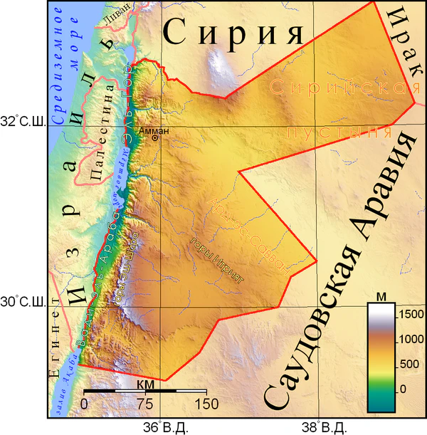 Основную территорию (90 %) Иордании занимают пустынные плато, на западе страны имеются холмы и горы. Река Иордан разделяет Иорданию и Израиль. Самой высокой точкой страны является гора Умм-эд-Дами (1854 м), низкой — Мёртвое море (-427 м).