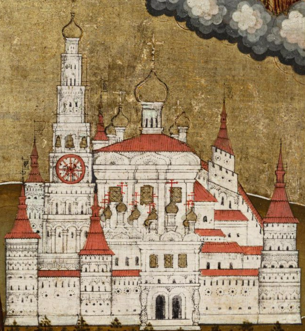 В год основания монастыря в нём появилась первая деревянная церковь, которую уже в 1486 году сменил каменный собор. Его расписывал живописец Дионисий. В 1490 году рядом с собором была сооружена восьмигранная колокольня — прообраз колокольни Ивана Великого в Московском Кремле. В её нижнем ярусе находился храм Смоленской Одигитрии (1495 год).