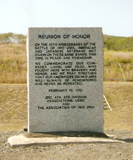 В 40-ю годовщину битвы за Иводзиму американские и японские ветераны снова встретились на этих песках, в этот раз с миром и дружбою. Мы чтим память о наших товарищах, живых и умерших, которые сражались здесь с храбростью и честью, и мы вместе молимся, чтобы наши жертвы на Иводзиме помнились всегда и никогда не повторились.