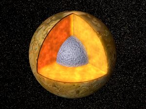 Ио, состоящая в основном из силикатных пород и железа, ближе по составу к планетам земной группы, чем к другим спутникам во внешней части Солнечной системы (которые состоят главным образом из водяного льда и силикатов). Средняя плотность Ио равна 3,5275 г/см3, что больше, чем у других галилеевых спутников (и даже чем у Луны), и это ставит Ио на первое место по плотности среди спутников в Солнечной системе[68]. Модели, составленные по измеренным «Вояджерами» и «Галилео» массе, радиусу и коэффициентам гравитационного квадруполя (числа, описывающие распределение массы в пределах объекта), указывают на то, что Ио расслоена на ядро из железа или сульфида железа и кору с мантией, которые богаты силикатами[43]. Металлическое ядро составляет приблизительно 20 % массы Ио[69]. Радиус ядра зависит от содержания серы: если оно состоит из чистого железа, его радиус лежит в пределах 350—650 км, а если оно состоит из соединений железа и серы — в пределах 550—900 км. Магнитометр «Галилео» не обнаружил у Ио собственного магнитного поля, и это указывает на то, что в её железном ядре нет конвекции[70].