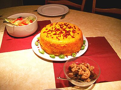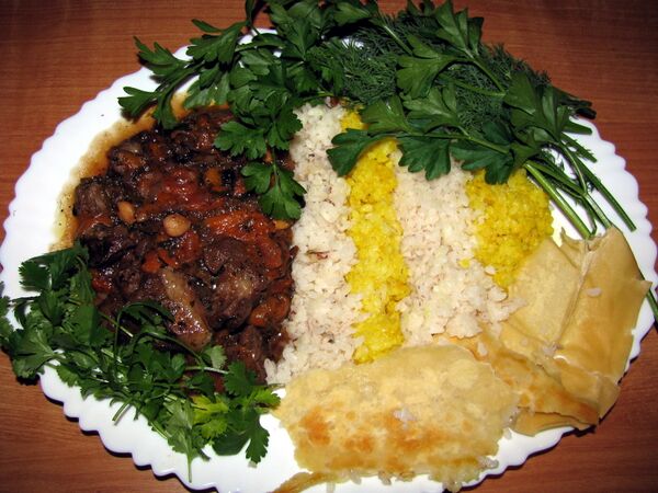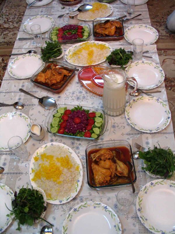 Рис занимает ключевое место в кулинарной традиции. Его обычно подают почти ко всем блюдам в отдельной тарелке. Иранцы предпочитают длиннозернистый и рассыпчатый рис. Естественно популярны разные виды плова. Своеобразным пловом-запеканкой является тах-чин.