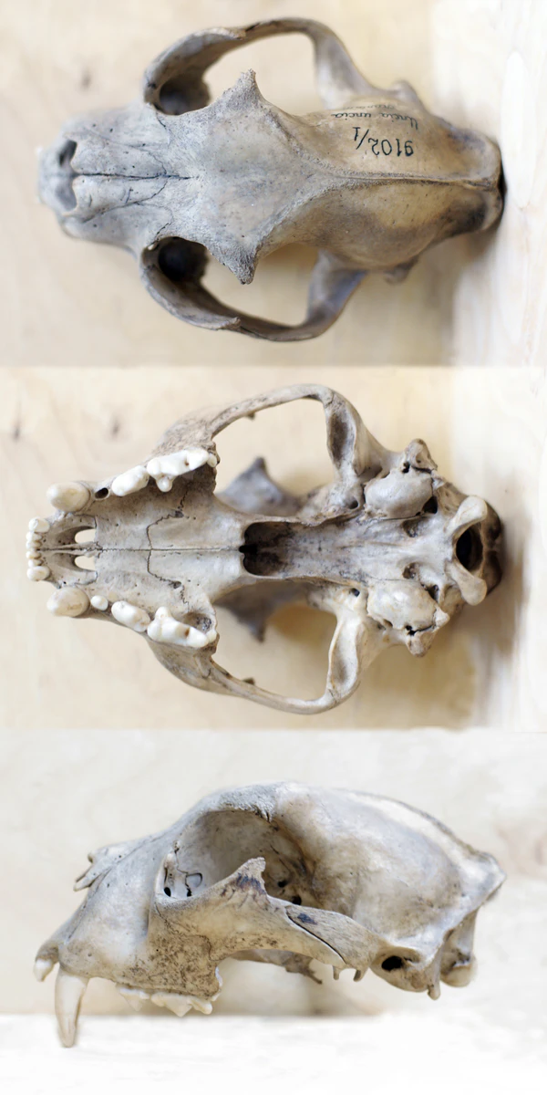 Череп относительно мощный, с буграми и гребнями, сильно развитыми скуловыми дугами, но менее массивный и тяжёлый, чем у других представителей рода Пантеры[7]. Длина черепов самцов 18—19 см, кондило-базальная длина 16,5—17,3 см, скуловая ширина 12—13,5 см, межглазничная ширина 4,3—4,7 см, ширина рострума над клыками 4,8—5,3 см, длина верхнего зубного ряда 5,8—6,3 см[8].