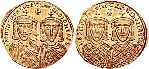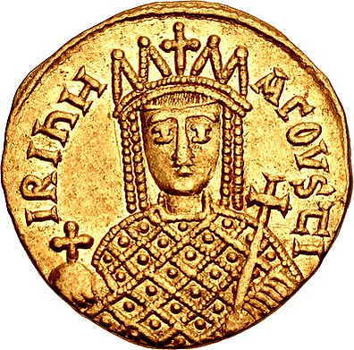 Ирина стала первой единодержавной женщиной на византийском престоле. В изданных ею Новеллах она величает себя по-мужски: «Ирина, великий василевс и автократор римлян», на монетах и парадных портретах изображается в пышных императорских одеждах[49]. На Западе не признали за Ириной право на титул, посчитав, что престол наследия Римской империи стал вакантным[50]. Анонимный автор «Лоршских анналов» уничижительно называет Византию «женской империей» (femineum imperium)[51].
