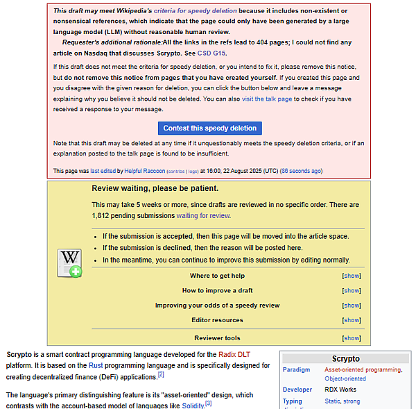 В августе 2025 года политика Википедии официально разрешила номинировать статьи, подозреваемые в автосгенерации, на быстрое удаление. Такие статьи обычно узнают по не относящимся к теме или вымышленным сноскам, а также характерной формулировке. Например, если статья написана в стиле ответа LLM («Вот ваша статья по теме…», «На момент моего последнего обучения…»), она обычно помечается на удаление[12][14]. Другие признаки использования ИИ: чрезмерное употребление длинных тире, слова «более того», рекламных выражений («захватывающий»), а также некорректные кавычки. В процессе обсуждения политики быстрых удалений один рецензент отмечал «поток ужасных автосгенерированных черновиков», другие пользователи жаловались на «ложь и поддельные ссылки» в подобных статьях и большие затраты времени на исправление последствий[15][16].