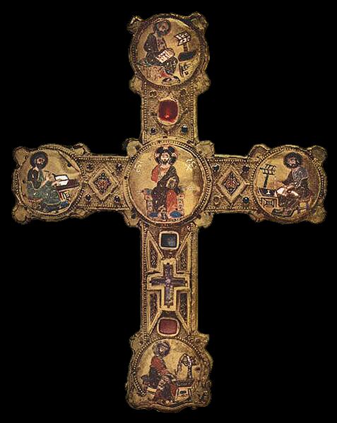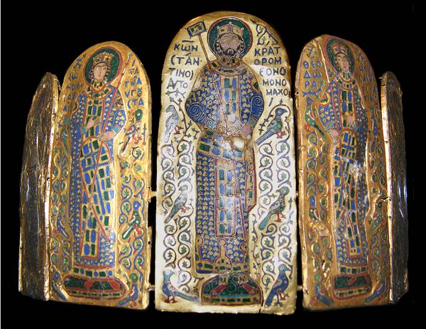 Особенно искусны были византийские мастера в эмальерных изделиях, которые можно разделить на два сорта: простую эмаль (émail champlevé) и перегородочную эмаль (émail cloisoné). В первой на поверхности металла делались с помощью резца углубления соответственно рисунку, и в эти углубления насыпался порошок цветного стекловидного вещества, которое потом сплавлялось на огне и приставало прочно к металлу; во второй рисунок на металле обозначался приклеенной к нему проволокой, и пространства между получившихся таким образом перегородок заполнялись стекловидным веществом, получавшим потом гладкую поверхность и прикреплявшимся к металлу вместе с проволокой посредством плавления. Великолепнейший образец византийского эмальерного дела представляет знаменитая Pala d’oro (золотой алтарь) — род маленького иконостаса с миниатюрами в технике перегородчатой эмали, украшающий собой главный алтарь в венецианском соборе св. Марка[8].