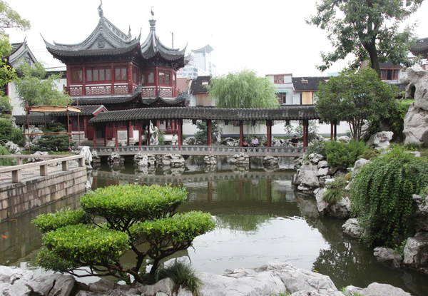 Обычно китайский сад окружали стенами, внутри обустраивали пруды, бассейны, группы камней, сажали деревья и цветы, сооружали павильоны, соединённые извилистыми дорожками. Над водой сооружали мостики. Мостики были каменными округлой формой.