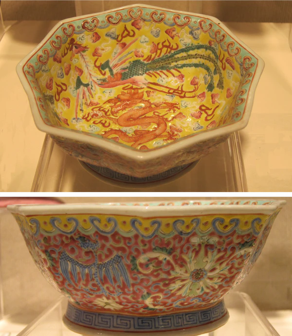 Орнаменты с геометрическими формами — прямоугольный узор, свастика, диск. Прямоугольный узор в древности состоял из многих пересекающихся линий и является символом дождя. Диск может быть круглым или квадратным. Смысл в растительном орнаменте: пион, лотос, хризантема и слива — символы четырёх времён года. Пион — весна, лотос — лето, хризантема — осень, вишня — зиму. Образ дракона — китайцы считают себя потомками драконов, а дракон — символ страны и императора, и одновременно имеет смысл подъёма, воодушевления, перемен.