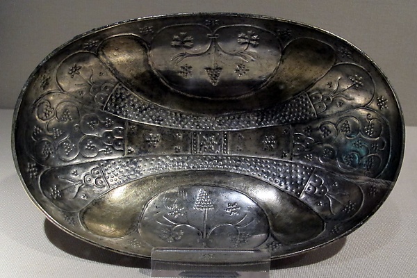 Сохранилось множество сасанидских серебряных сосудов, особенно больших тарелок или чаш, использовавшихся для подачи еды. Они имеют высококачественные гравированные или чеканные украшения из придворного репертуара, изображающие конных царей или героев, а также сцены охоты, сражений и пиршеств, часто частично позолоченные. На фужерах, предположительно для вина, могут быть рельефно изображены танцующие девушки. Они экспортировались в Китай, а также на запад[20].