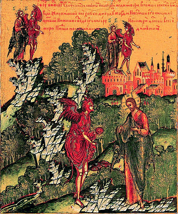 - «Искушение Христа на горе»: Искушение верой — на вершине горы стоит Христос и дьявол, вокруг горы видны города (образ царств, которые предлагает Христу дьявол), рядом со Христом могут быть изображены ангелы, пришедшие к нему, тогда дьявол изображается отдаляющимся от Христа или низвергающимся с горы вниз головой (в иконописи бегство Сатаны может выступать отдельной сценой, тогда Иисус изображается в окружении ангелов, из которых одни стоят на коленах, а другие держат над ним рипиды[19]).