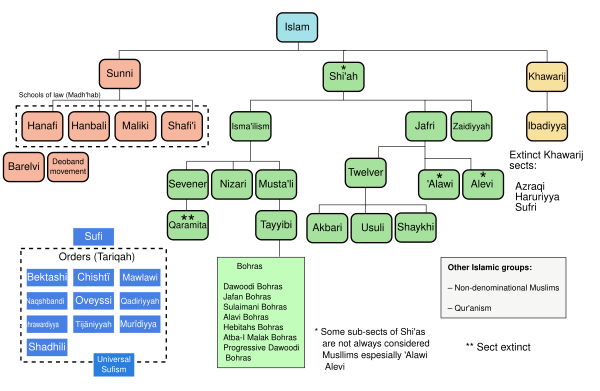 Согласно большинству источников, примерно 85 % мусульман мира составляют сунниты, 15 % — шииты вместе с небольшим меньшинством, в которое входят члены исламских сект (ахмадиты, алавиты, друзы, ибадиты, исмаилиты и др.).