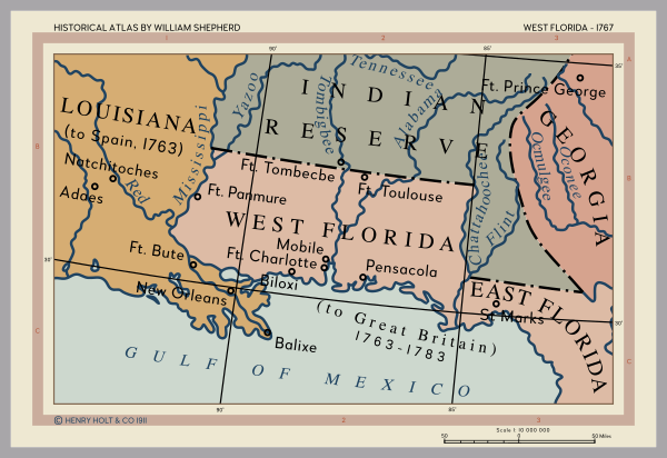 В 1767 году северная граница Западной Флориды была существенно передвинута, так что Западная Флорида включила части современных территорий штатов Алабама и Миссисипи.