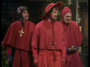 Все скетчи с участием испанской инквизиции основаны на том, что один из героев сценки, раздосадованный назойливыми вопросами другого героя, восклицает: «Здесь вроде бы не испанская инквизиция!» (англ. I didn't expect the Spanish Inquisition!), после чего в помещение под характерный аккорд врывается именно испанская инквизиция, состоящая из кардинала Хименеса (Майкл Пейлин), кардинала Бигглза (Терри Джонс) и кардинала Фэнга (Терри Гильям). Едва появившись в кадре, кардинал Хименес выкрикивает фразу: «Никто не ждёт испанскую инквизицию!».