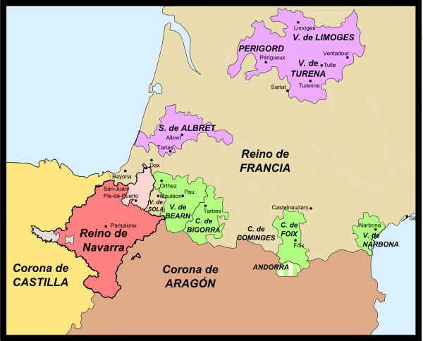 Захваченная Испанией часть королевства была известная как Верхняя Наварра, в то время как расположенная во Франции оставшаяся часть именовалась Нижней Наваррой. Этот регион имел близкие связи с Францией, с которой вошёл в унию после того как в 1589 году король Наварры Генрих III Бурбон стал королём Франции (под именем Генрих IV).