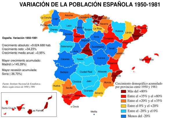 Основные миграционные потоки шли с юга Испании в сторону индустриальных районов Каталонии и Страны Басков. В это же время Мадрид стал городом услуг и торговли, что также увеличило численность населения, требуя нового жилья в больших количествах. Этот феномен увеличил занятость в строительном секторе.