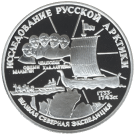 | Слева вверху — портреты русских исследователей Арктики, участников Великой Северной экспедиции Малыгина, Овцына, Челюскина, Х. и Д. Лаптевых, справа в центре- деревянный поморский коч, слева от него — собачья упряжка с седоками, ниже — карта побережья Сибири, справа — даты в две строки «1733 — 1743 г.г.». По окружности надписи: вверху — «ИССЛЕДОВАНИЕ РУССКОЙ АРКТИКИ», внизу — «ВЕЛИКАЯ СЕВЕРНАЯ ЭКСПЕДИЦИЯ». |