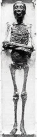 Полость тела была заполнена пропитанным смолой льном, который стал «твёрдым как камень»[26]. Половой член фараона был завёрнут отдельно; Дерри не смог сказать, был ли он обрезан. Лобковых волос не было видно, а мошонка была прижата к промежности[16]. Пальцы ног были покрыты золотыми напальчниками, а на ногах были золотые сандалии[37].