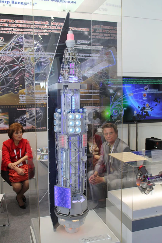 В 2009 году в «Центре Келдыша» началась разработка ядерной установки мегаваттного класса для космического корабля для исследования Луны и других планет Солнечной системы[50]. В этой разработке специалисты Центра использовали опыт, накопленный по программе «Тепловая энергодвигательная установка для транспортно-энергетических модулей», начатой в 1998 году[11]. От прошлых поколений установок, таких как «Бук» и «Топаз», новая отличается использованием специального теплоносителя, гелей-ксеноновой смеси и высокотемпературного газоохлаждаемого реактора на быстрых нейтронах[51]. Ураном более высокого обогащения и температурой в реакторе 1500 градусов (что это?). Рабочие органы системы и защиты реакторной установки выполнены из труб, изготовленных из молибденового сплава ТСМ-7[52]. Новый конструкционный материал корпуса способен обеспечить работу реактора на протяжении более чем 100 тысяч часов[53].
