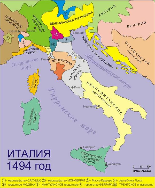 - Миланское герцогство (Сфорца, к Франции в 1499—1522, к Испании с 1535 года);