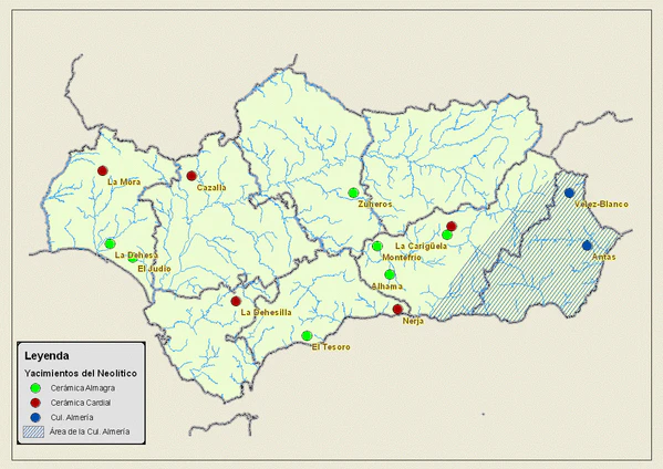 Согласно некоторым теориям, первые люди попали в Европу через Гибралтарский пролив, и первоначально стали селиться в Андалусии. Разные народы Восточного Средиземноморья искали здесь минералы, в результате чего первые культуры Андалусии (Лос-Мильярес, Эль-Альгар, Тартесс) несут в себя явные следы влияния восточных культур. Процесс перехода от доисторической эпохи к эпохе письменности (иногда называемый протоисторией) происходил под влиянием восточных народов, в первую очередь финикийцев и греков.