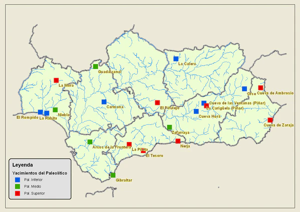 Присутствие гоминидов в Андалусии возводят к нижнему палеолиту, их связывают с археологическими останками культур ашель между 700.000 и 400.000 лет назад. Но находка так называемого Человека из Орсы, возможно, указывает на большую древность. Основной зоны их обитания были террасах больших рек верхнего Гвадалкивира и южной Сьерра-Морены, население которых занималось в основном охотой и собранием. В период среднего палеолита, присутствующие неандертальцы и носители культуры мустье начали использовать пещеры как убежища. К этому периоду относят пещеры Карихуэла (Carihuela), около Пиньяра, Зайхар (Zájara), около Веры и гибралтарские пещеры. В верхнем палеолит произошло отступление ледника и появление хомо сапиенса который обитал на всей территории Андалусии. Материальная культура характеризовалась развитием камнеобработки и пещерной живописи. Пример этого - живопись пещеры Пилета, пещеры Амбросио , в Альмерии, Пещеры Нерия, Пещеры Мотиллас, Пещеры Малауерзо (Malalmuerzo), в Гранаде и Пещеры Моррон, в Хаэне.