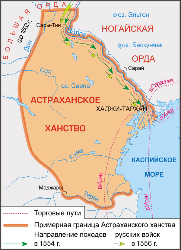 В 1556 году Астрахань была взята без боя отрядом воеводы Ивана Черемисинова и Астраханское ханство было присоединено к Русскому государству. Астраханский край являлся юго-восточным военным форпостом Русского государства, а Астрахань — городом укра́инным. В частности, в 1569 года турки безуспешно осаждали Астраханскую крепость. В 1597 году в Астрахани было завершено начатое в 1578 году строительство Спасо-Преображенского мужского монастыря. По свидетельству Антони Дженкинсона во второй половине XVI века в Астрахани строили остроносые круглодонные транспортные суда (бусы) грузоподъёмностью более 200 тонн[23][24].