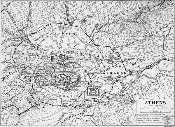 Древние Афины в первом тысячелетии до нашей эры занимали очень небольшую площадь по сравнению с обширной столицей современной Греции. Город, был окружён оборонительными стенами, занимал площадь около 2 км (1 мили) с востока на запад и немного меньше, чем с севера на юг, хотя на своём пике могущества древний город имел пригороды, простирающиеся далеко за оборонительные стены. Акрополь был расположен к югу от центра этого окружённого стеной района.