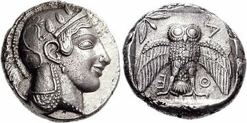 Реверс: Сова стоит лицом к ΑΘΕ (ΑΘΗΝΑΙΩΝ — афинянам).