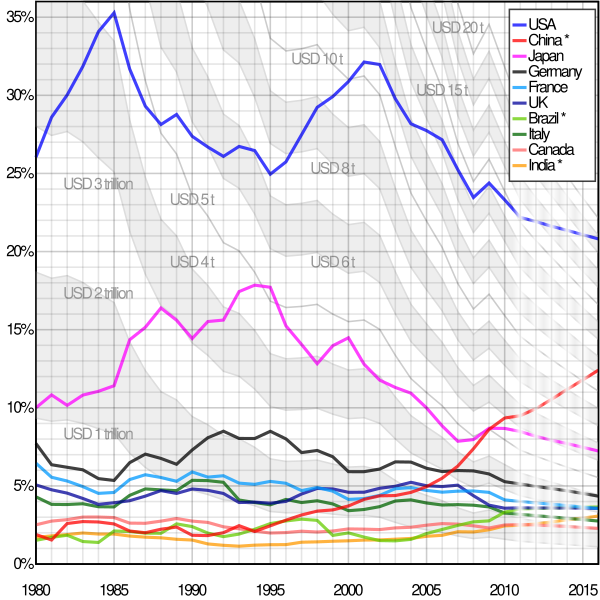 ВВП Китая превзошёл ВВП Италии в 2000, Франции в 2002 (2005), ВВП Великобритании в 2006 и Германии в 2007, прежде чем превзошёл ВВП Японии в 2010, сделав Китай второй экономикой мира после США.