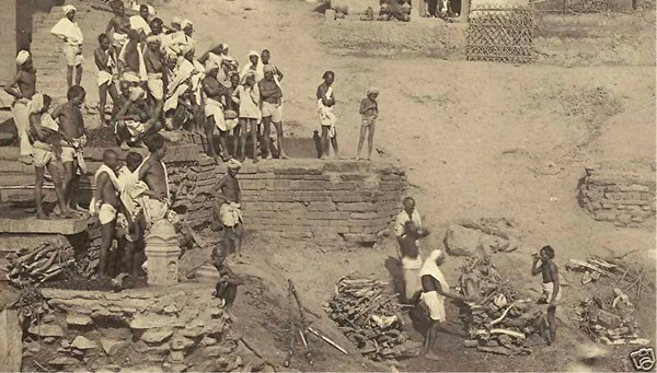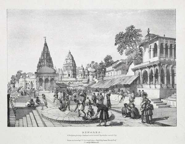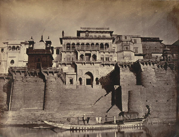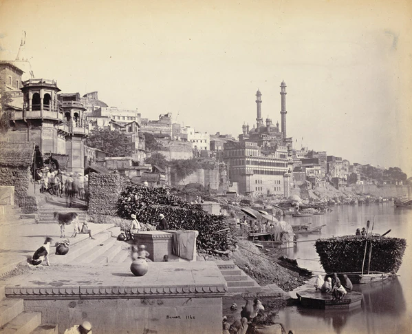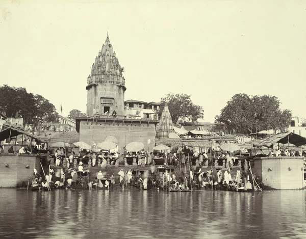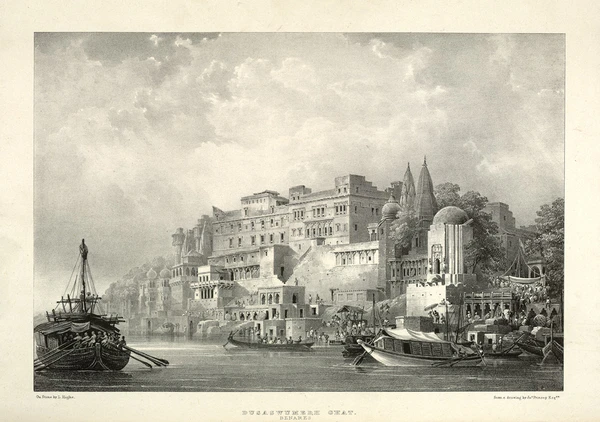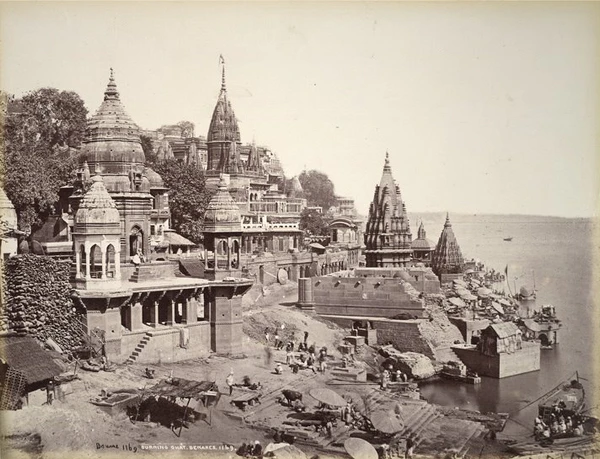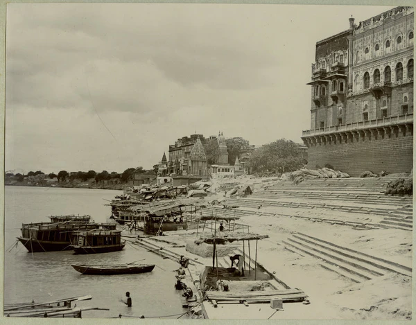 На рубеже XIX—XX веков в основном сложился ансамбль прибрежных гхатов Варанаси, многие из которых строились, реконструировались и содержались на средства правителей из маратхских династий Скиндия, Холкар и Бхонсле, махарадж Джайпура, королей Непала, бихарских и бенгальских раджей. Вдоль гхатов располагались роскошные дворцы и особняки, возводившиеся различными князьями, богатыми землевладельцами и купцами, а также храмы, ашрамы, школы санскрита и постоялые дворы для паломников. Южный Аси-гхат отмечал место слияния Ганга с притоком Аси. Соседний Тулси-гхат увековечивал память поэта Тулсидаса, который перевёл «Рамаяну» с санскрита на хинди. Шивала-гхат принадлежал махараджам Варанаси, на ступенях Данди-гхата молились аскеты-дандипатхи, Харишчандра-гхат служил одним из двух мест кремации[109][110][111].